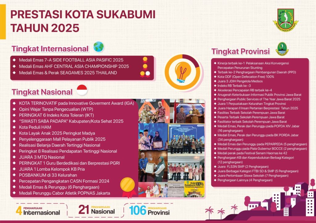 fokuseditor SUKABUMI – Sepanjang tahun 2025, Kota Sukabumi menerima 131 penghargaan dari mulai tingkat provinsi hingga internasional, yang diraih baik oleh individu maupun oleh pemerintah daerah.